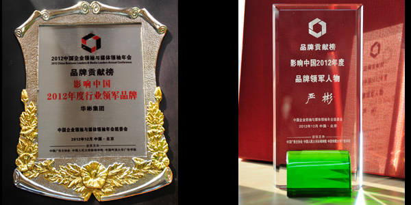 2012中國企業領袖與媒體領袖年會12月20日在北京隆重開幕,備受關注的年度品牌貢獻榜盛大發布,華彬集團摘取“影響中國2012年度行業領軍品牌”大獎,華彬集團董事長嚴彬博士榮獲“影響中國2012年度品牌領軍人物”榮譽。